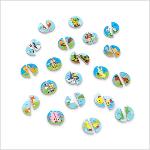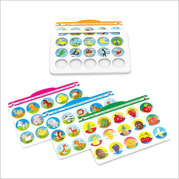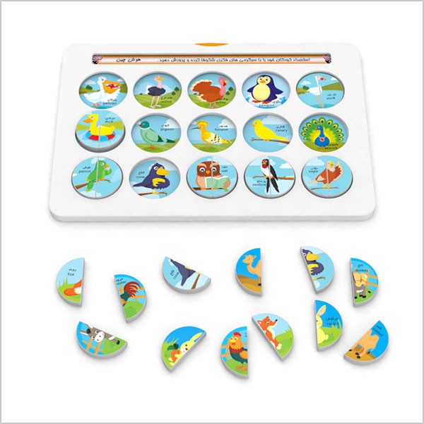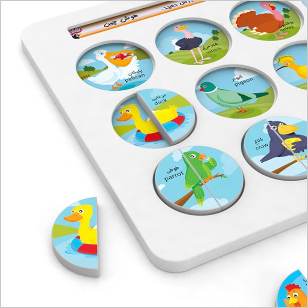 این مجموعه شامل یک صفحه پلاستیکی با ۱۵ حفره، ۴ صفحهی تصویری و ۱۲۰ نیم دایرهی متناظر با تصاویر روی کارتهاست. هدف از بازی جایگذاری هر دو قطعه نیم دایره در حفرهی مربوط به تصویر مرتبط با آنهاست. یادگیری رابطه و تناظر، آشنایی با حیوانات اهلی، حیوانات جنگل و میوهها و همچنین افزایش هوش طبیعتگرا و علاقمند کردن کودکان به زمینه طبیعت گرایی ازاهداف آموزشی این مجموعه محسوب میشود. در عین حال دو تکه بودن قطعات، افزایش قدرت تجسم و همچنین بالا رفتن قدرت تطبیق کودکان را به دنبال خواهد داشت.